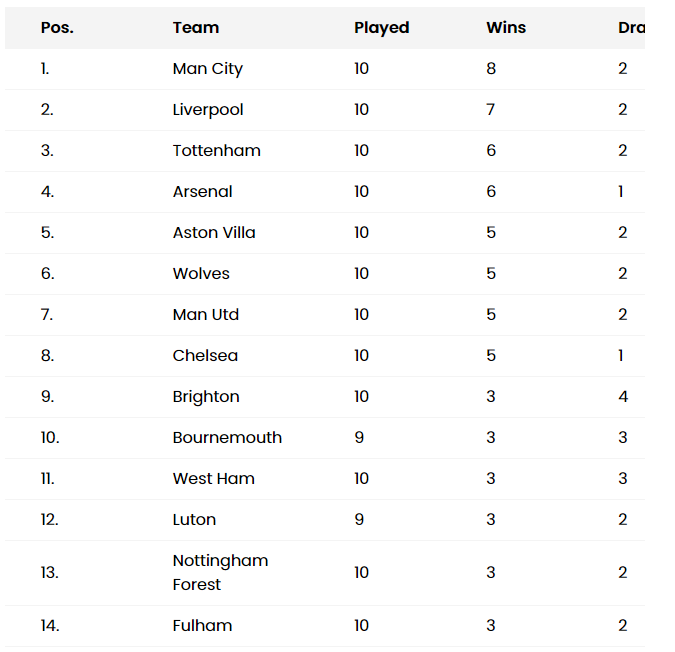 Nhìn vào bảng phong độ gần đây trong 10 ngày thi đấu gần nhất tại Premier League, Manchester City nổi bật là đội có thành tích tốt nhất, duy trì chuỗi bất bại với 8 chiến thắng. Liverpool theo sát với 23 điểm sau 10 trận gần nhất, trong khi Arsenal cũng thể hiện phong độ mạnh mẽ với 5 trận thắng liên tiếp.
