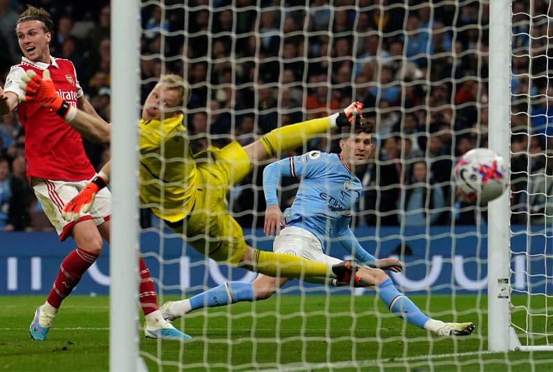 Ở phút đầu giờ đầu tiên của hiệp 1, khi tỷ số đang là 1-0 nghiêng về phía Man City, Kevin de Bruyne có tình huống đá phạt để John Stones bật cao đánh đầu vào góc xa tung lưới Aaron Ramsdale nhân đôi cách biệt cho đội chủ nhà.