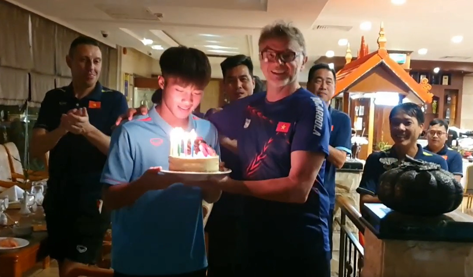 Ngoài việc cho đội nghỉ ngơi nhiều hơn, tối qua (4/5), ông Troussier còn tự tay thắp nến, mang bánh kem và hát chúc mừng sinh nhật tiền đạo Quốc Việt bước sang tuổi 20. Đây cũng là cách để HLV Troussier và các học trò gắn kết và tăng sự tự tin để tiếp tục hướng tới mục tiêu bảo vệ thành công tấm HCV bóng đá nam SEA Games.
